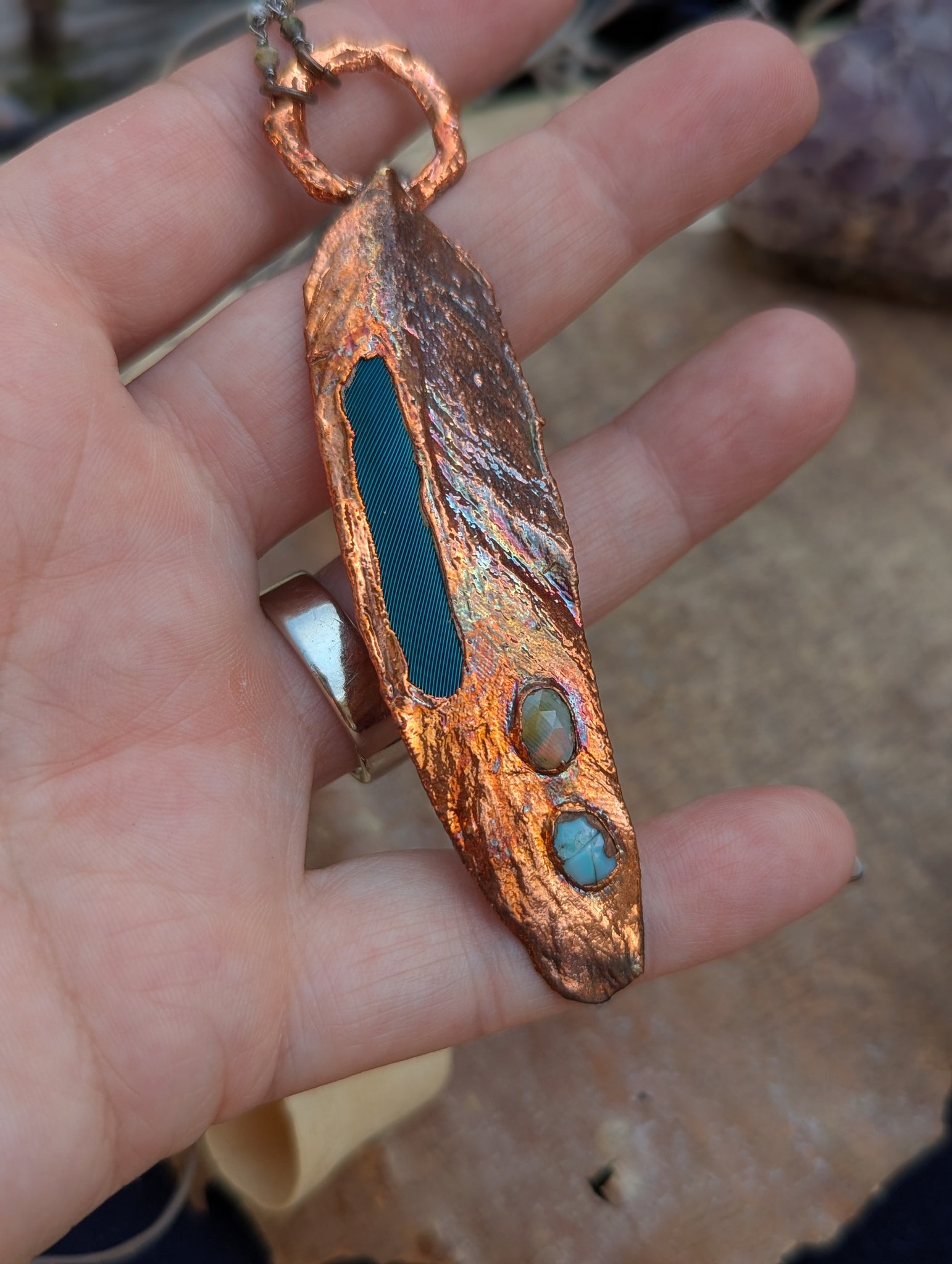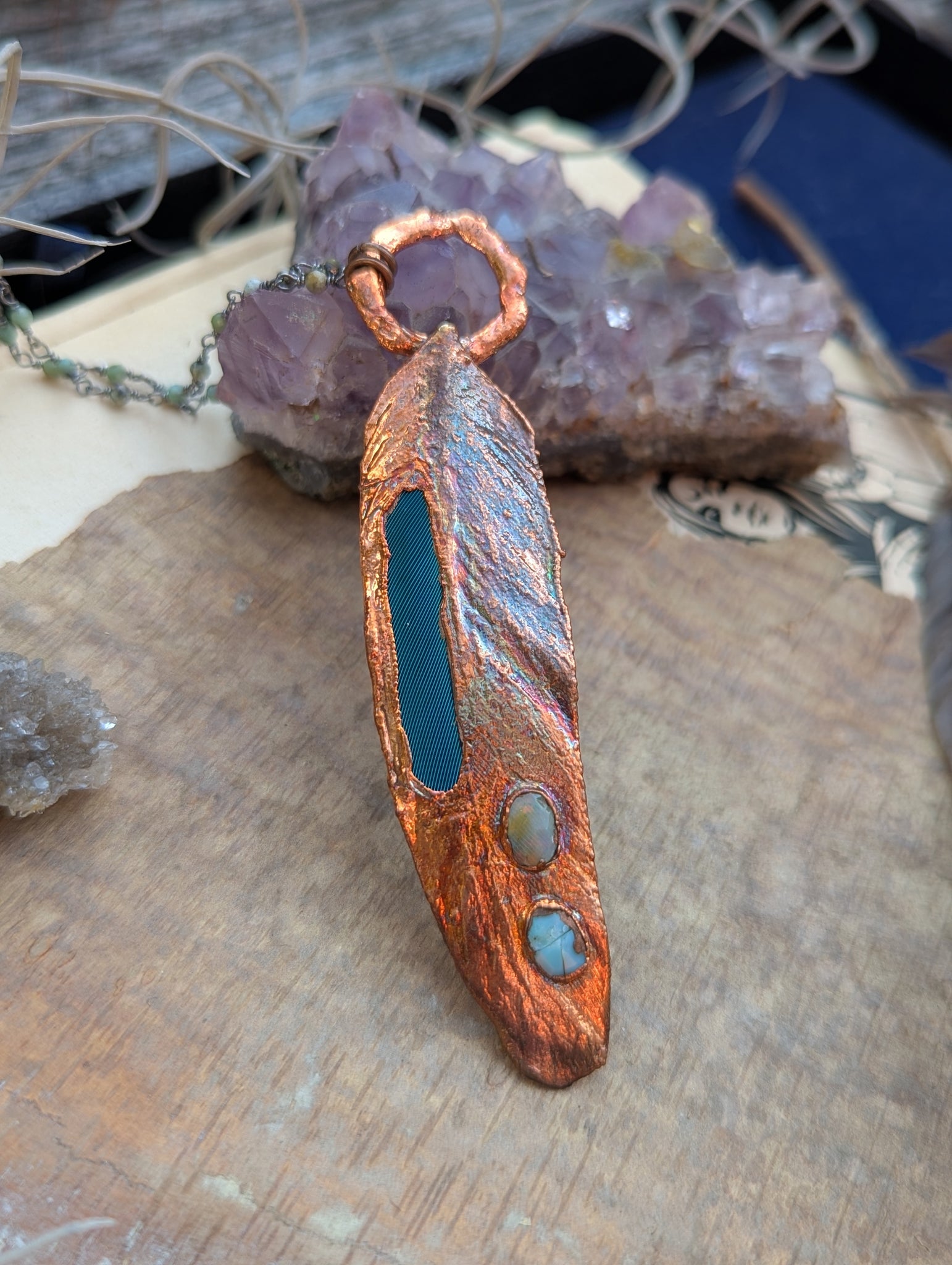 A real blue macaw feather (naturally shed from a captive raised macaw in a friend's parrot rescue sanctuary), copper electroformed with a section of feather left exposed. Accented with Welo opals. Price is discounted because one opal fractured during the creation process.