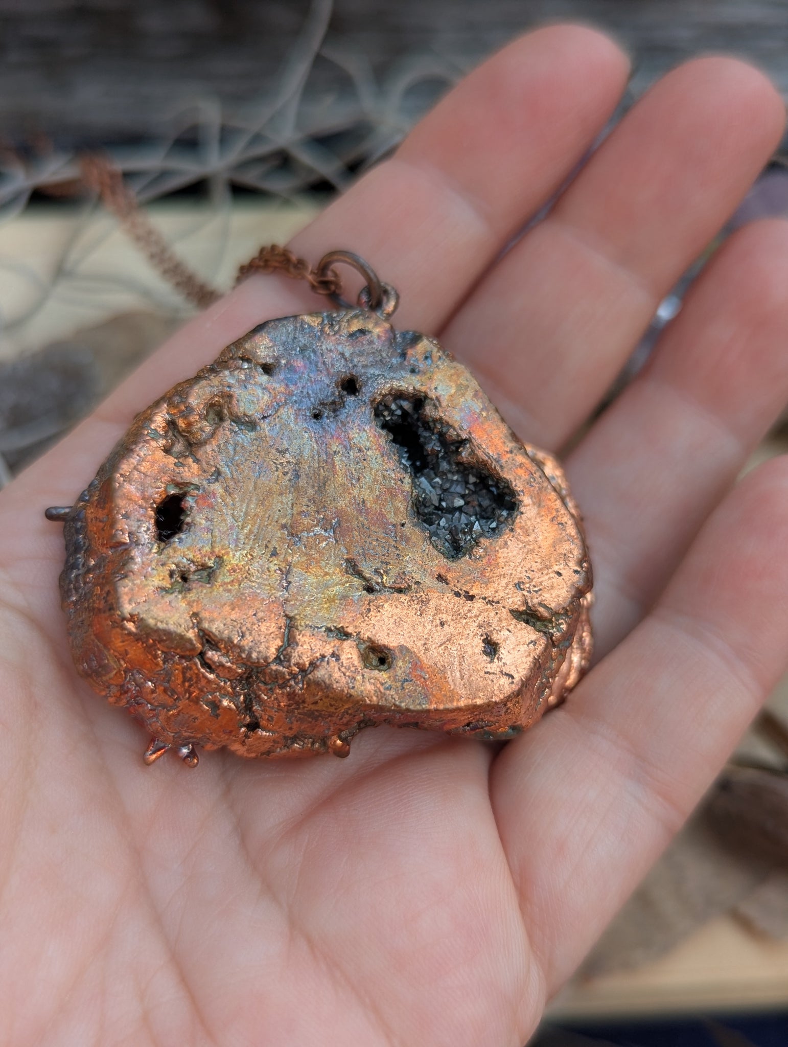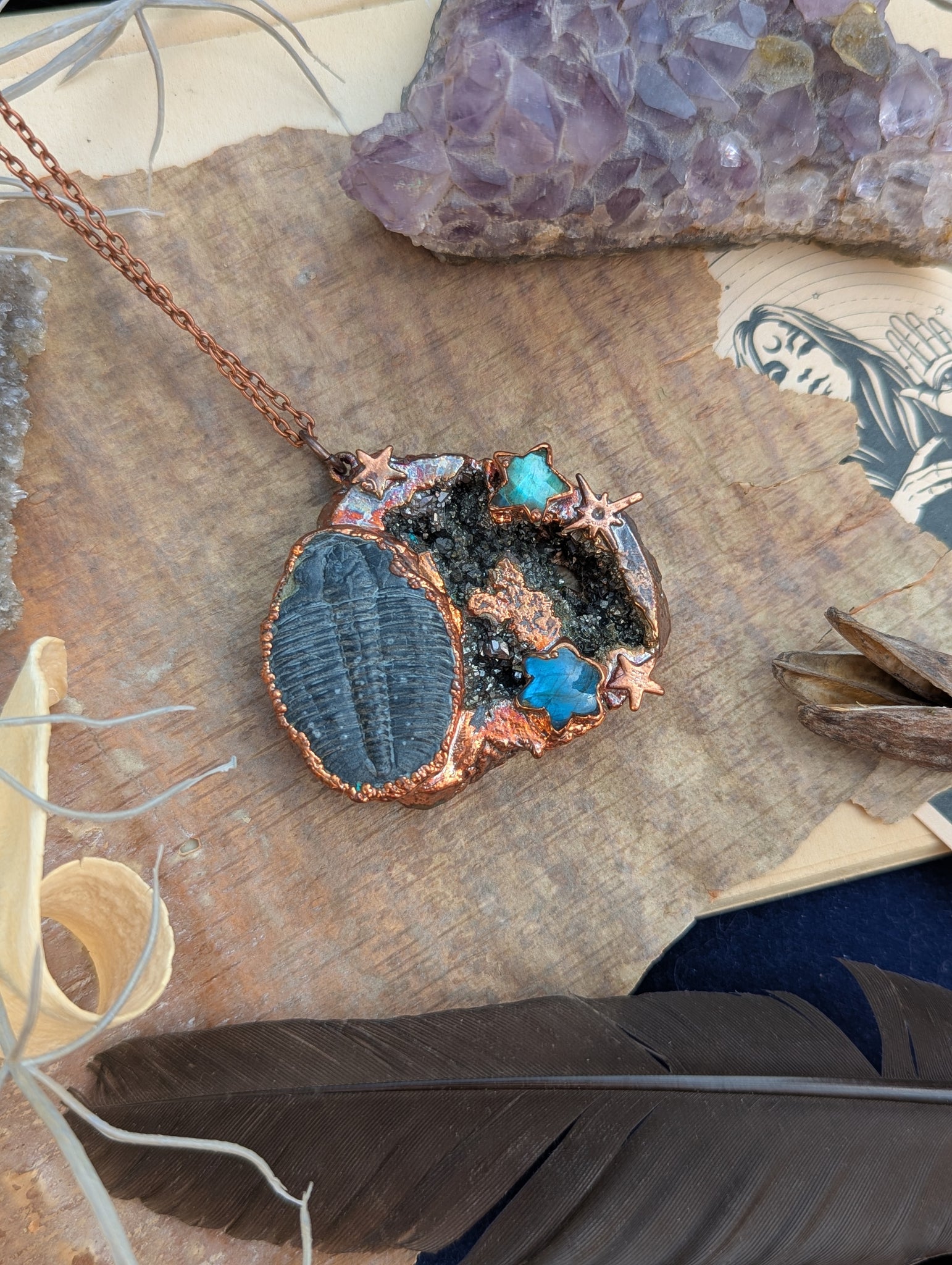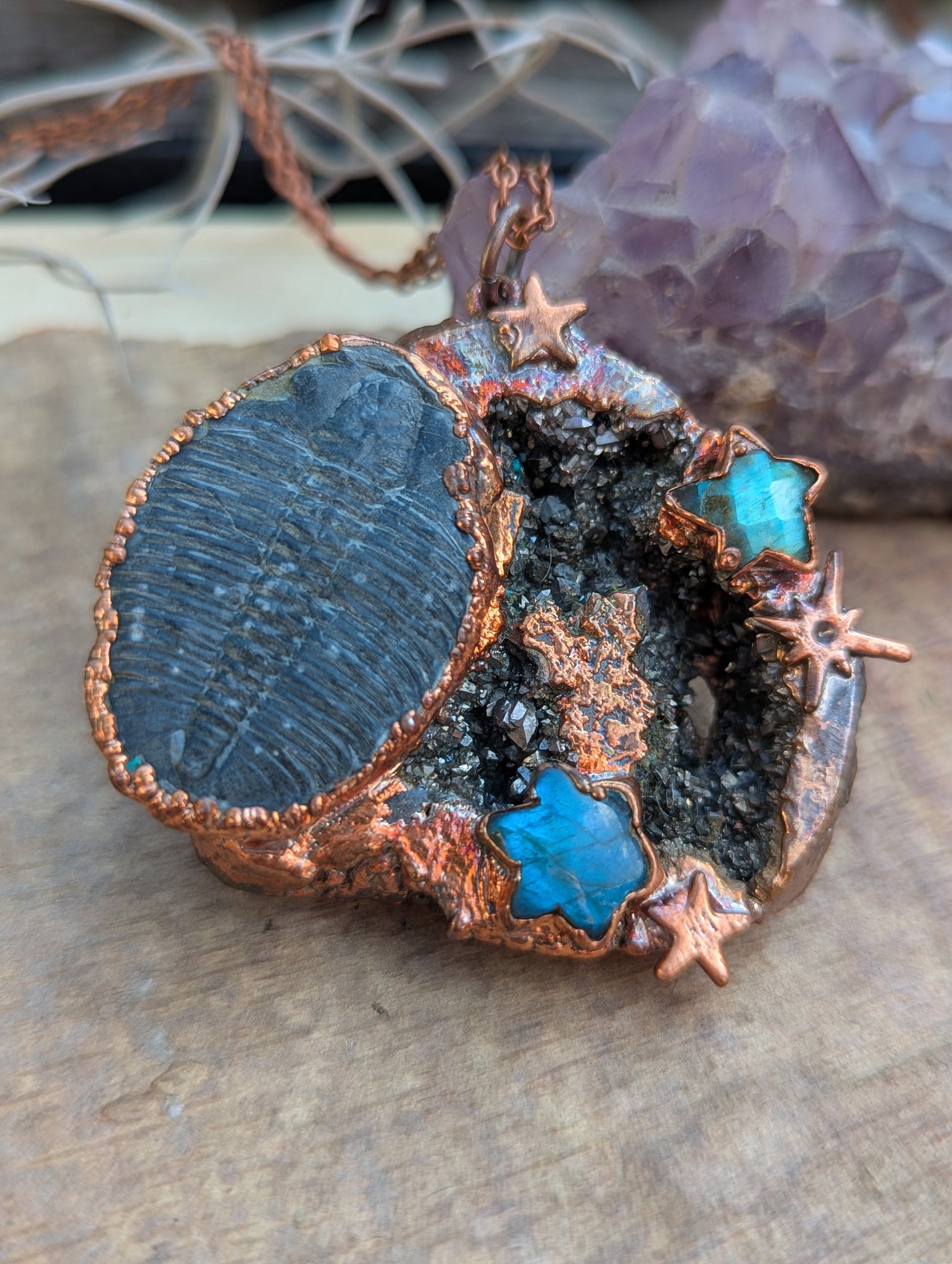 Copper electroformed trilobite fossil (mined in Utah) with black-aura coated druzy, and labradorite stars.