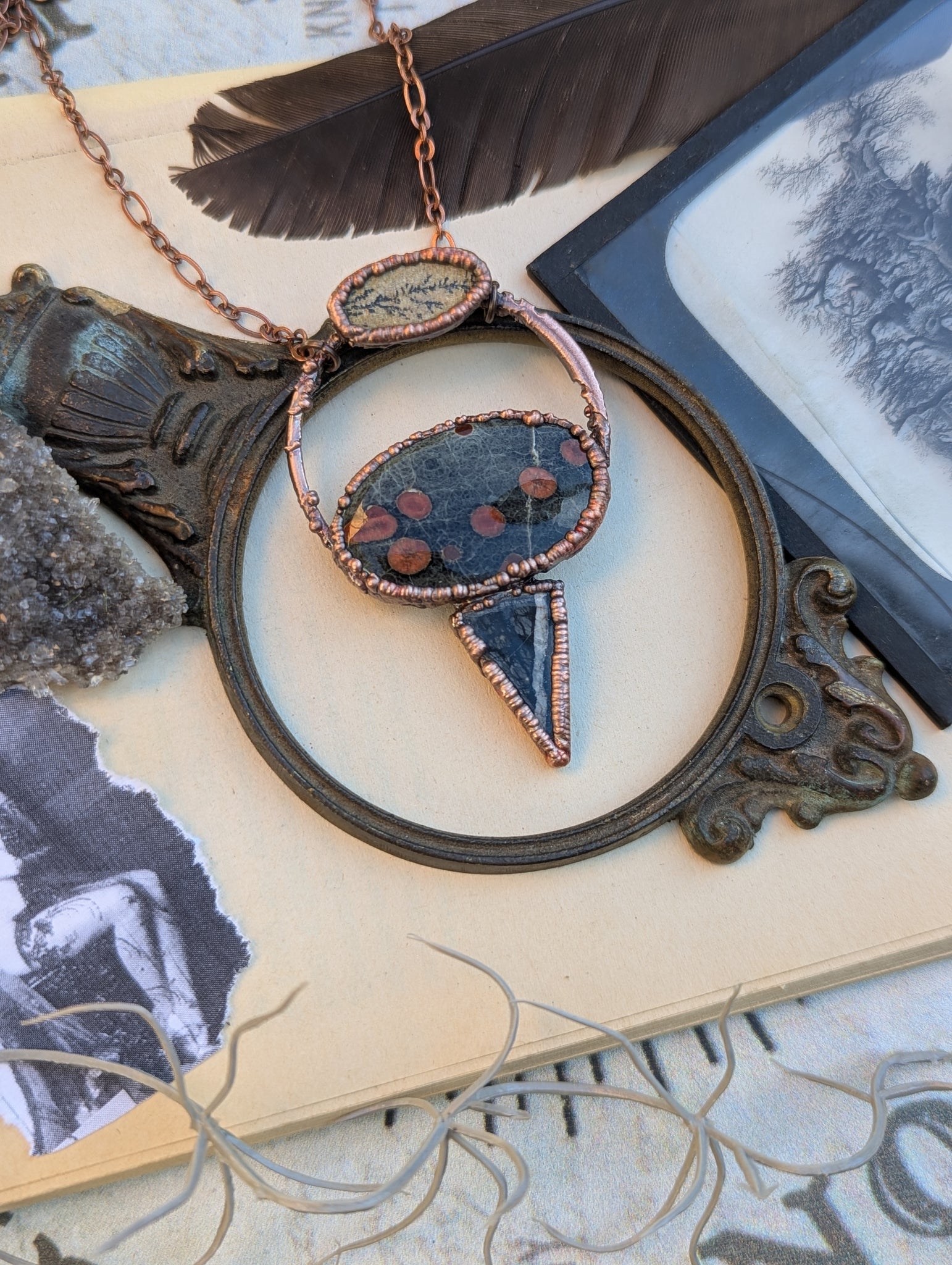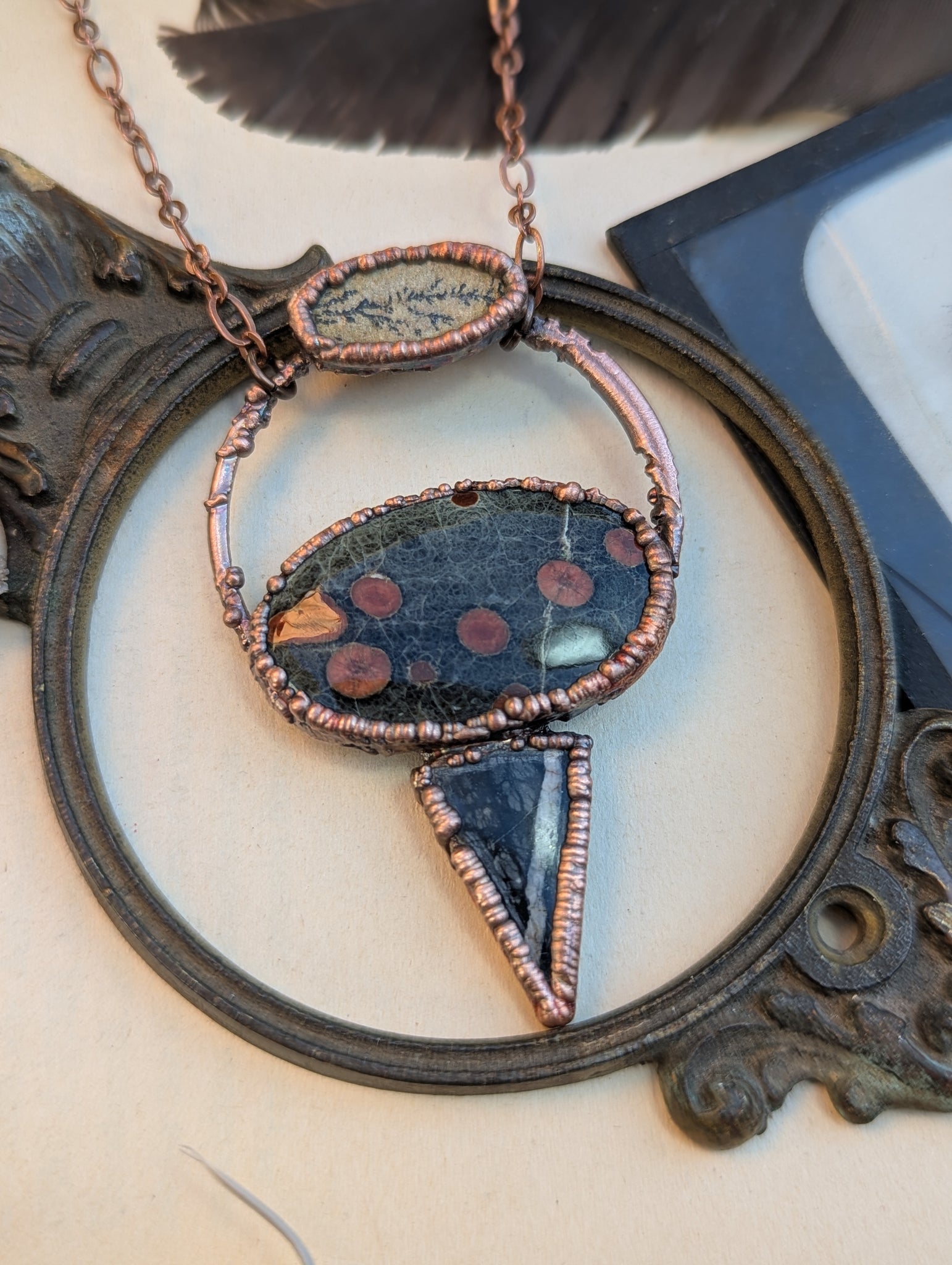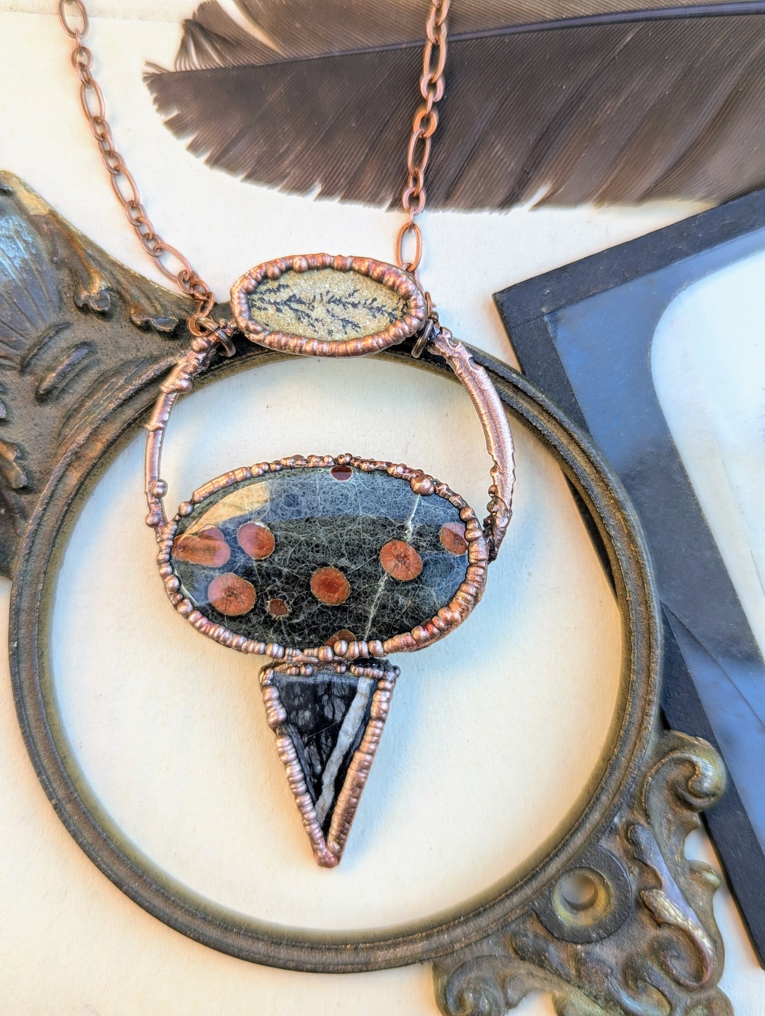 Copper electroformed dendritic psilomene, peanut obsidian (which reminds me of pumpkins!), and picasso jasper. A trio of gemstones perfect for spooky season!