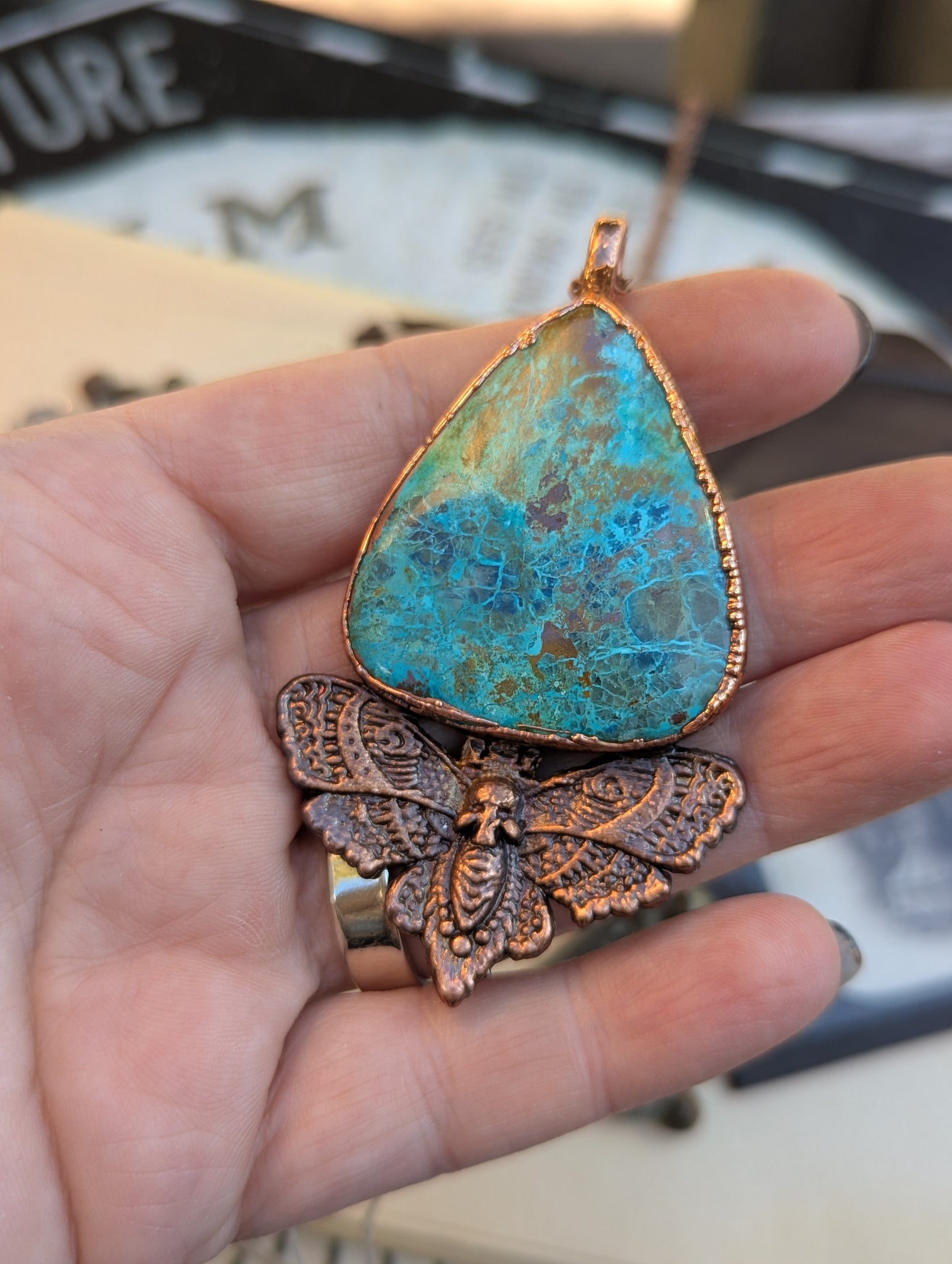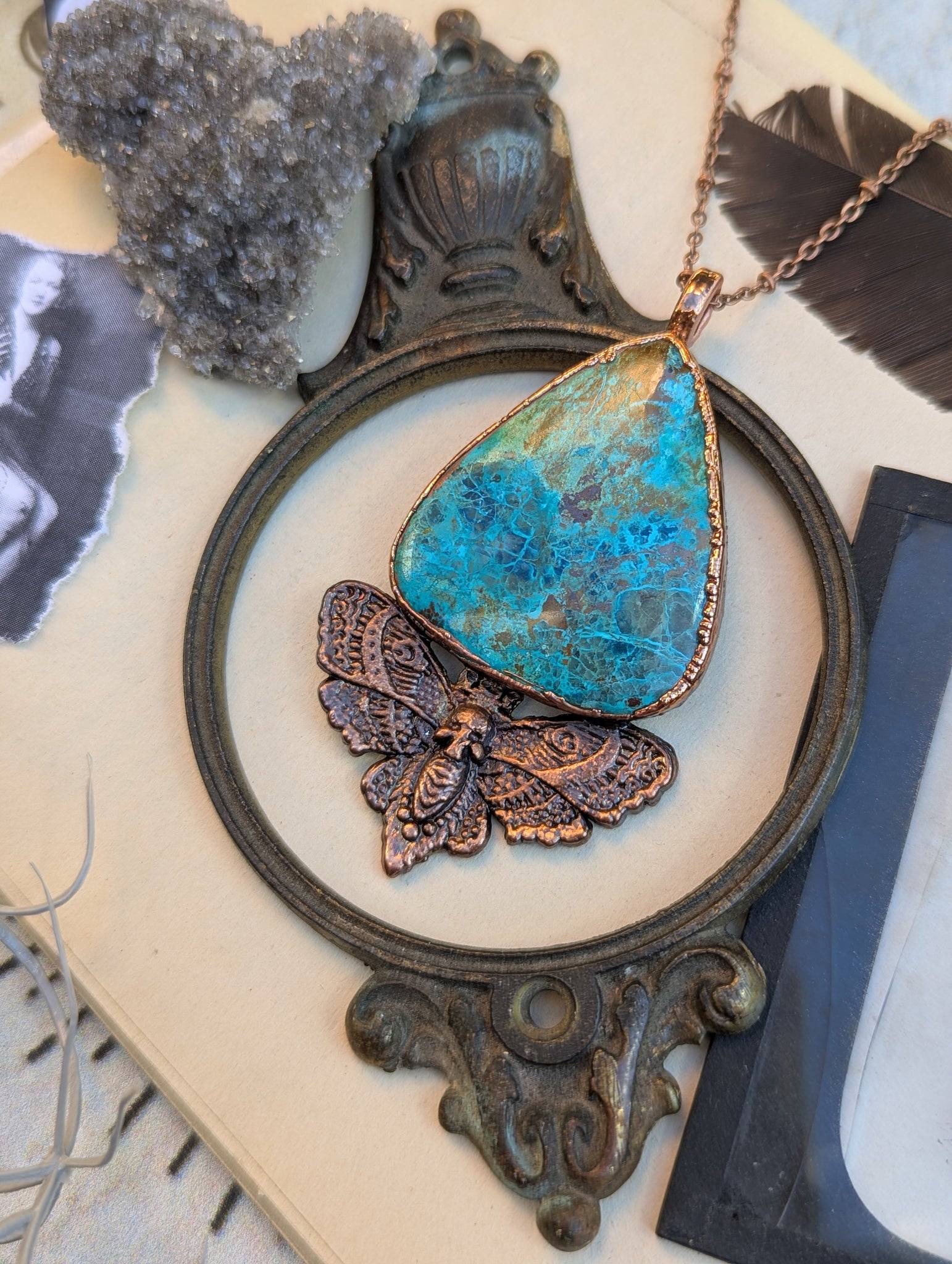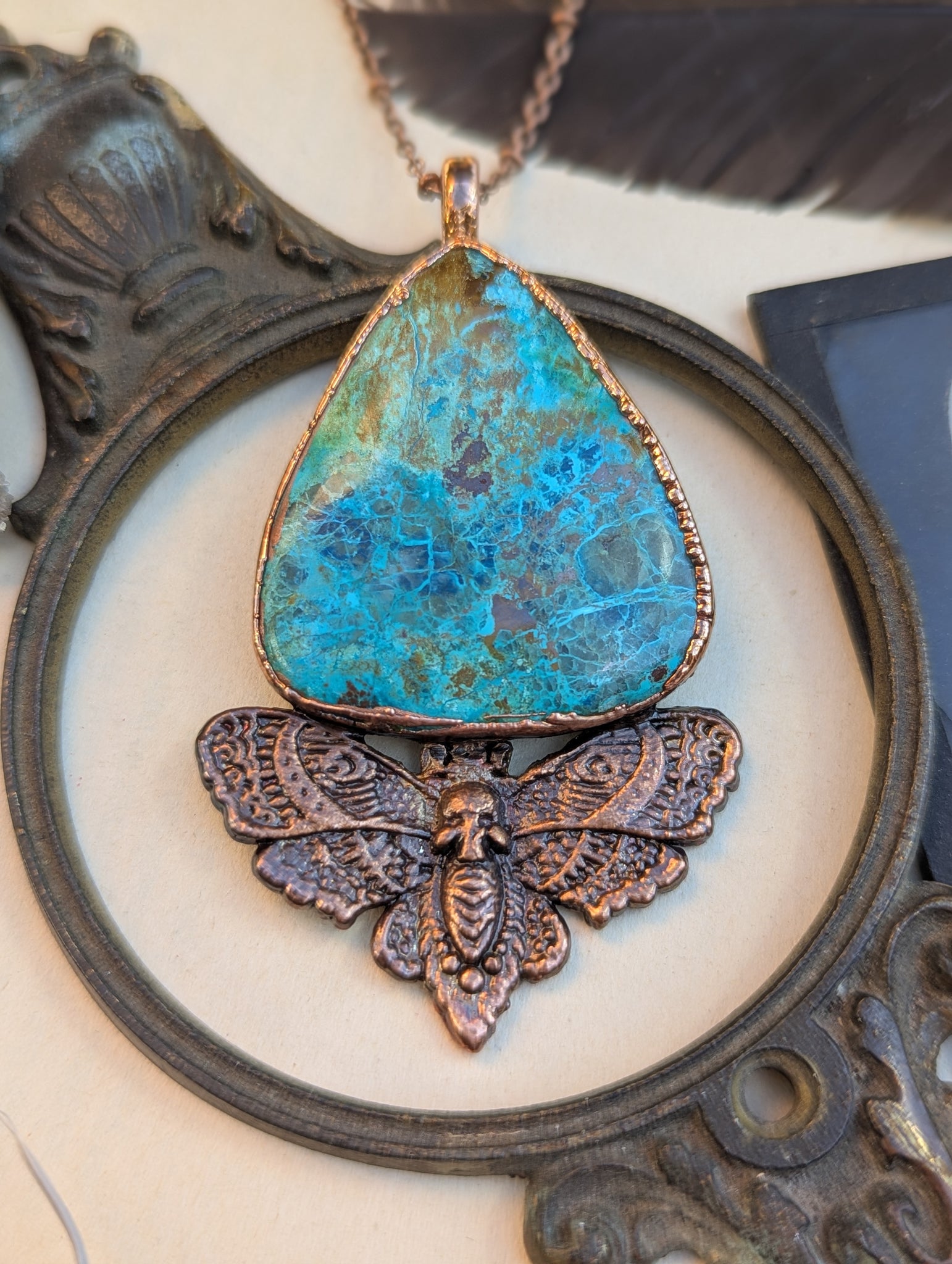 A beautiful piece of chrysocolla, in gorgeous shades of teal and aqua with coppery earthy tones, copper electroformed with a death head moth.
