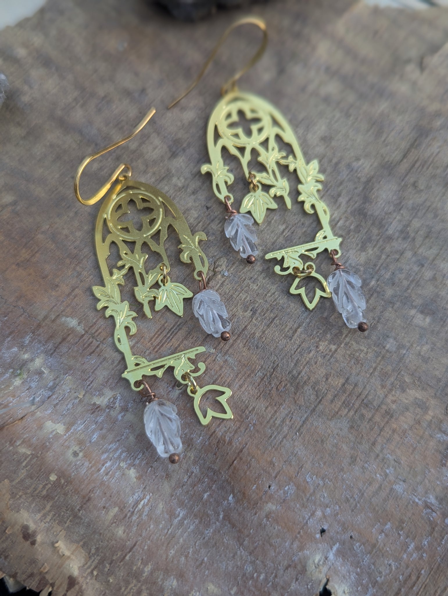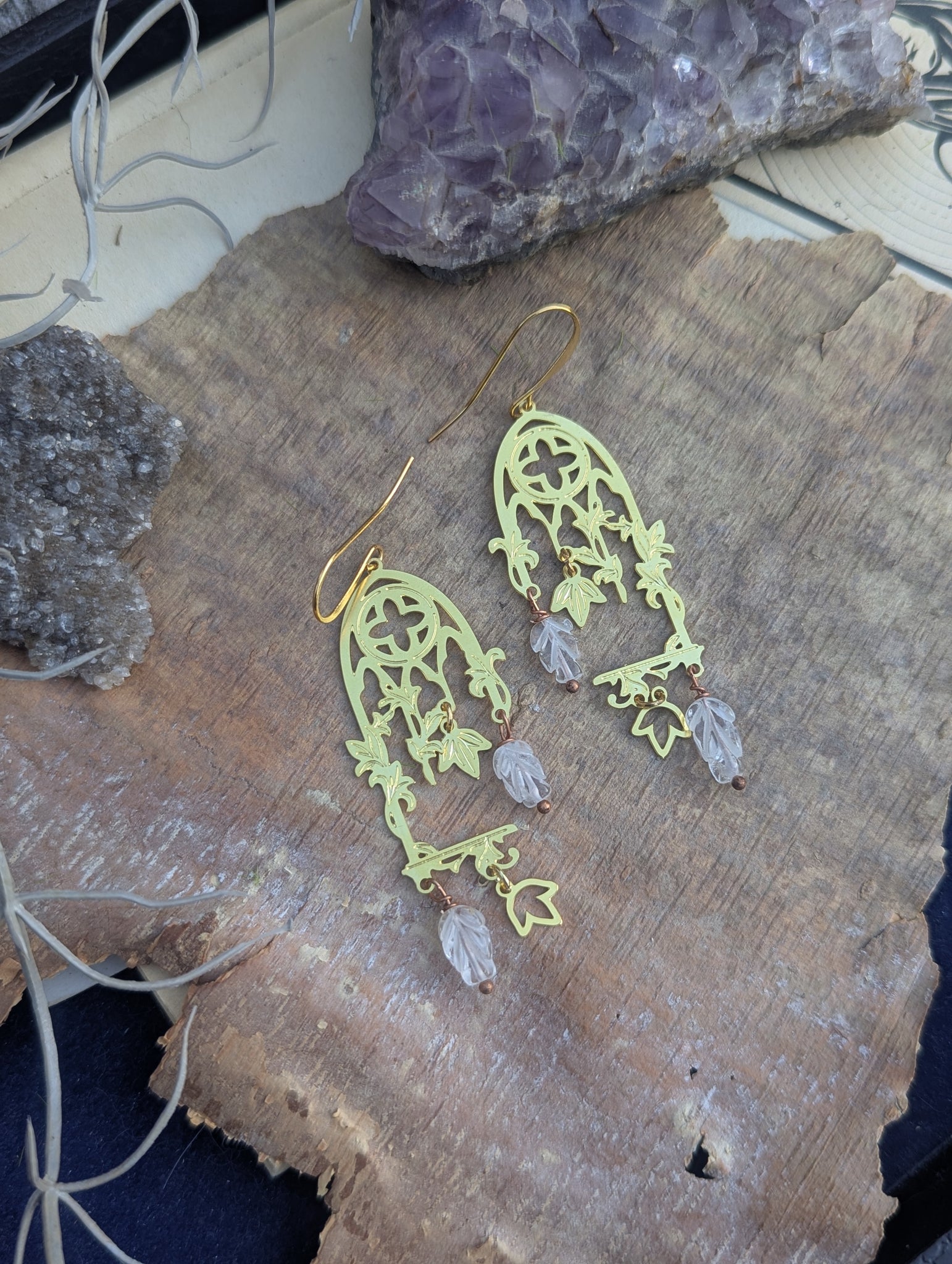 These turned out so beautifully! Gothic, vine encircled brass windows with hanging brass and carved quartz leaves. Romantic, light, and so much movement.