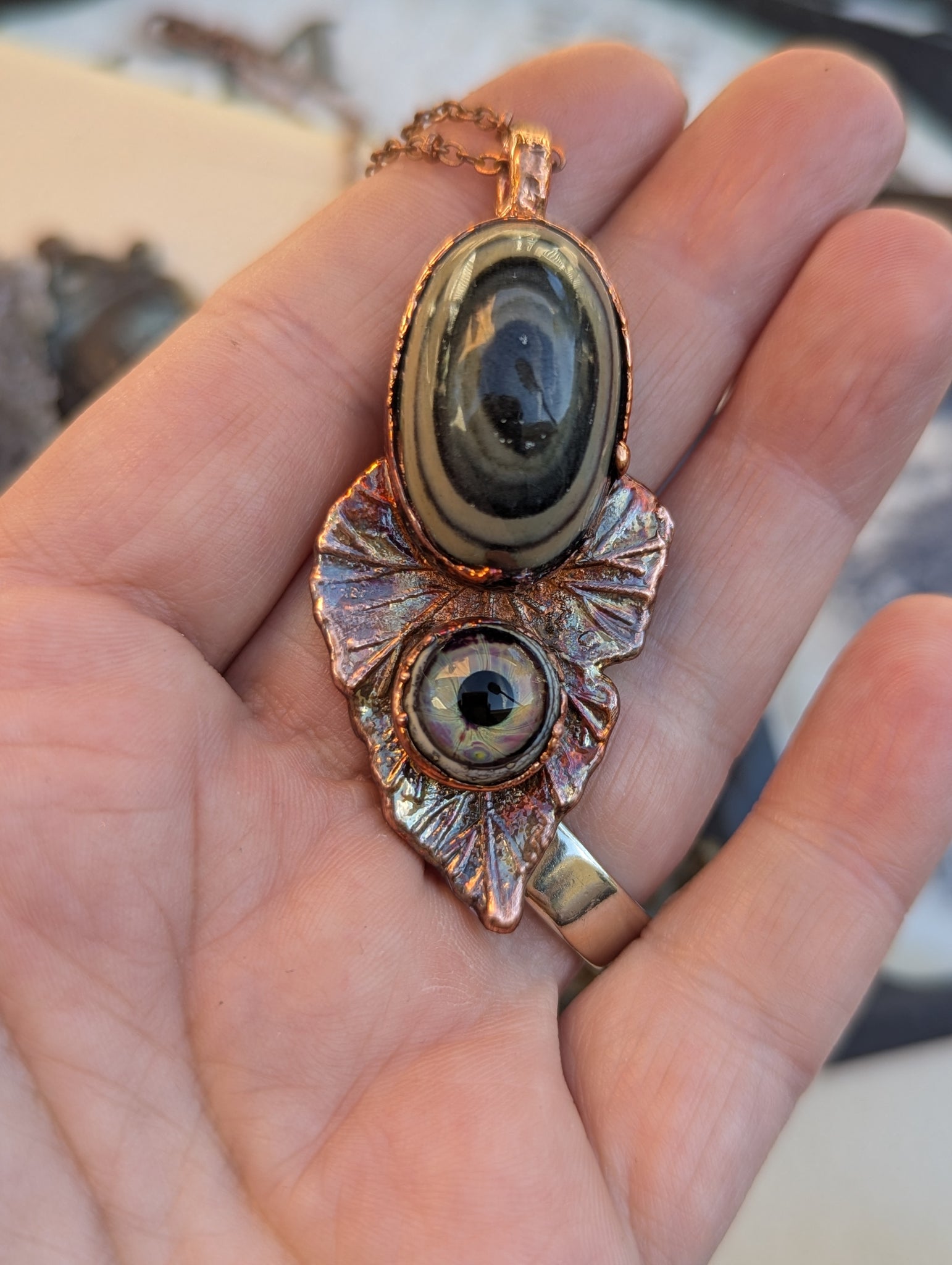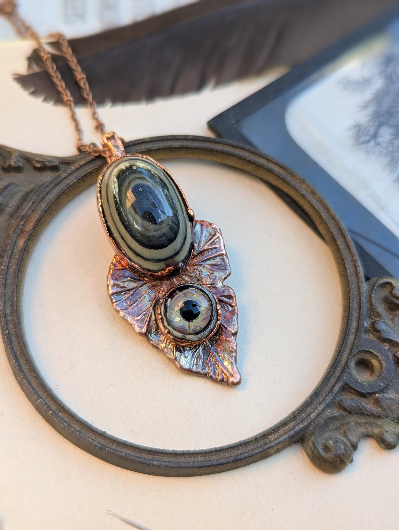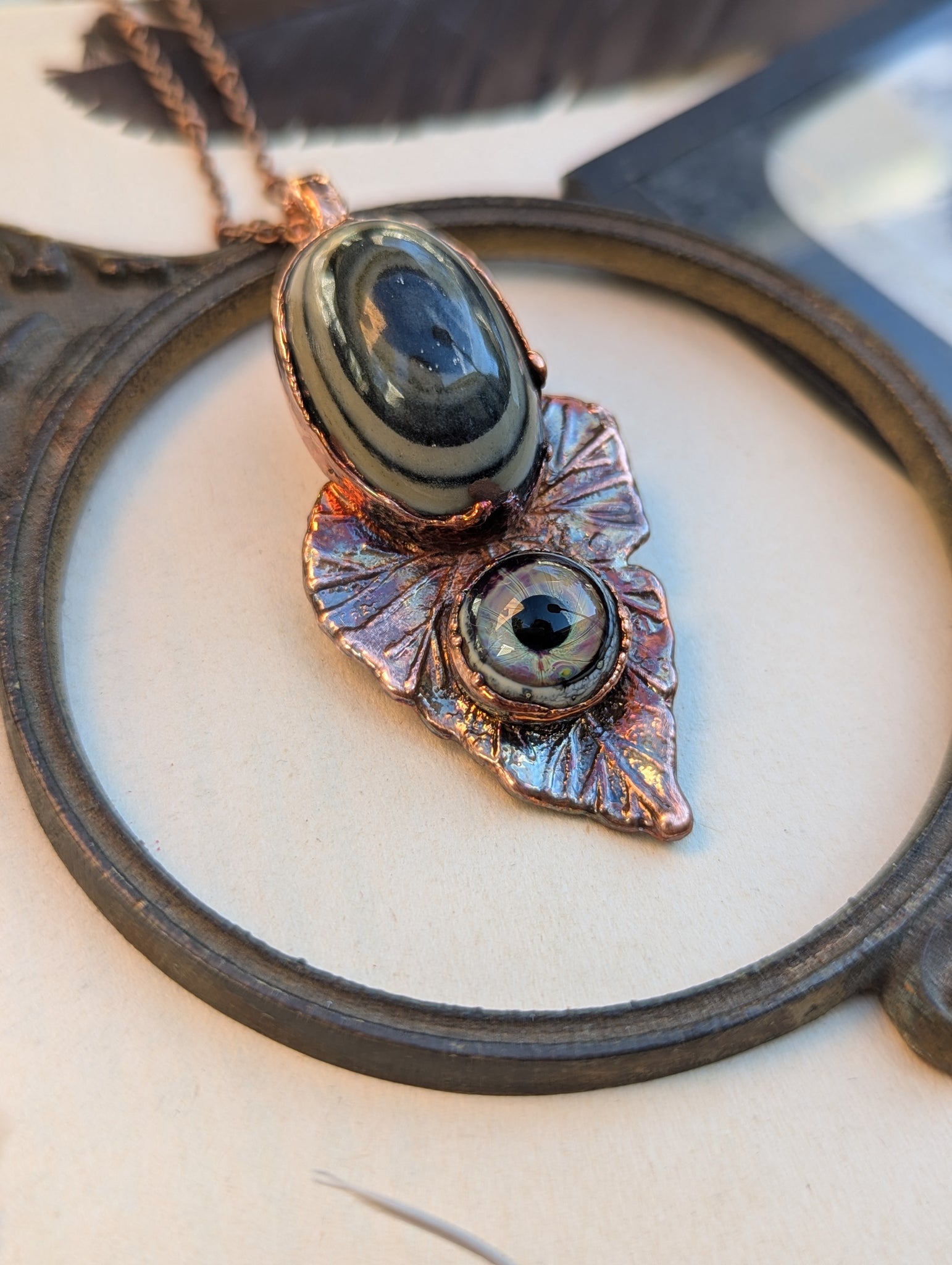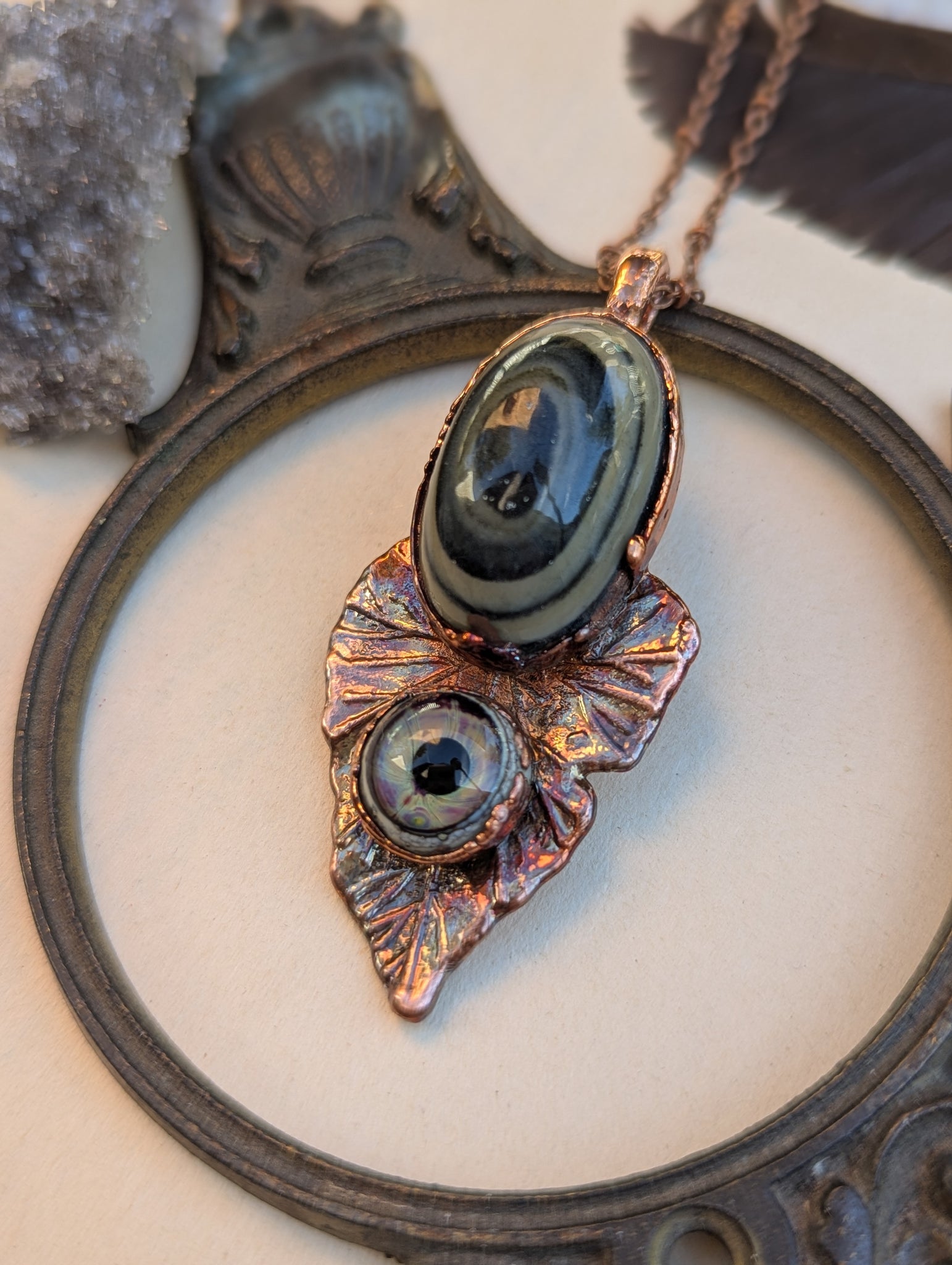 Copper electroformed hypnotic green eye opal with an artisan-made lamp work glass eye, set on a leaf charm.