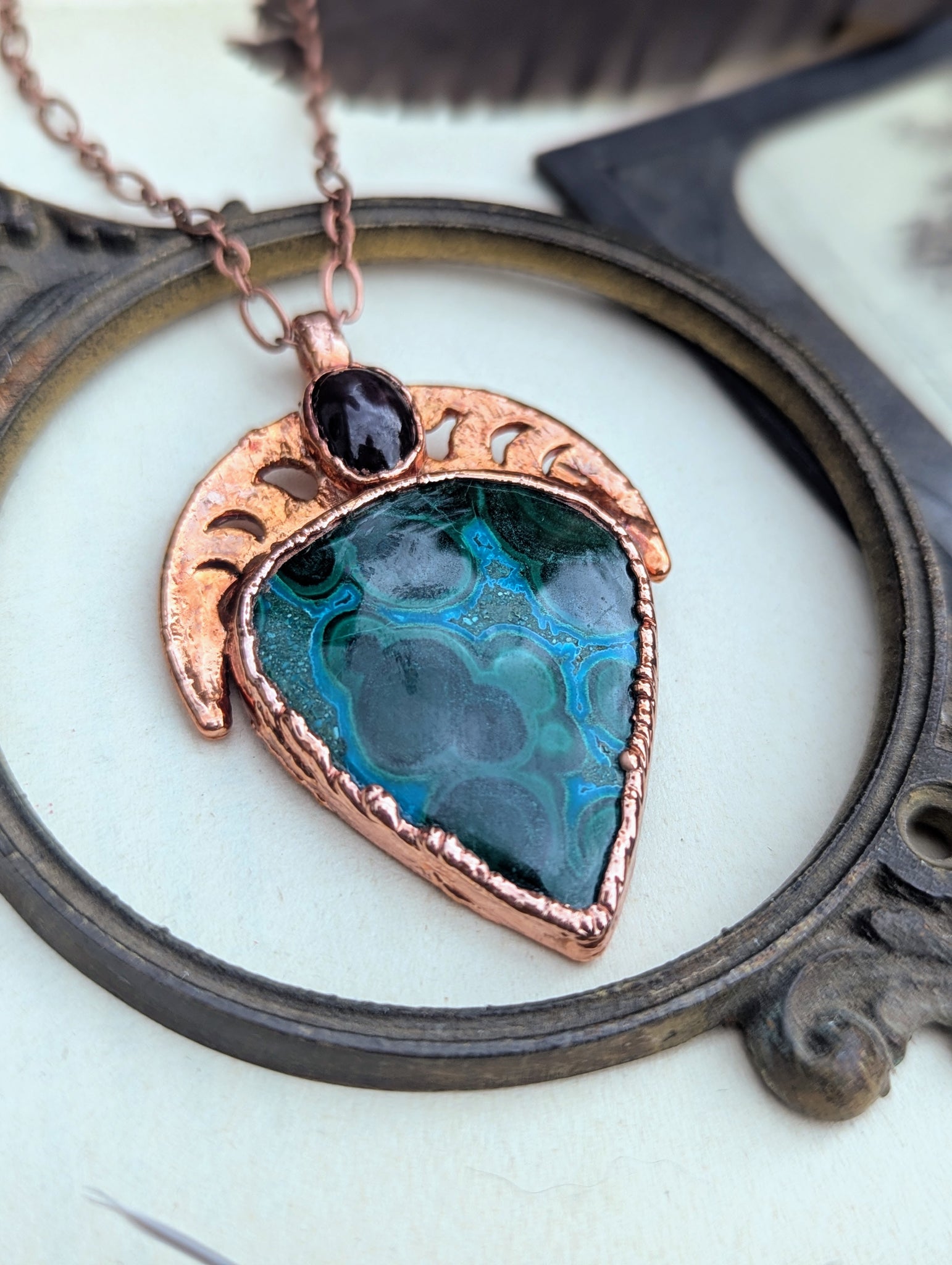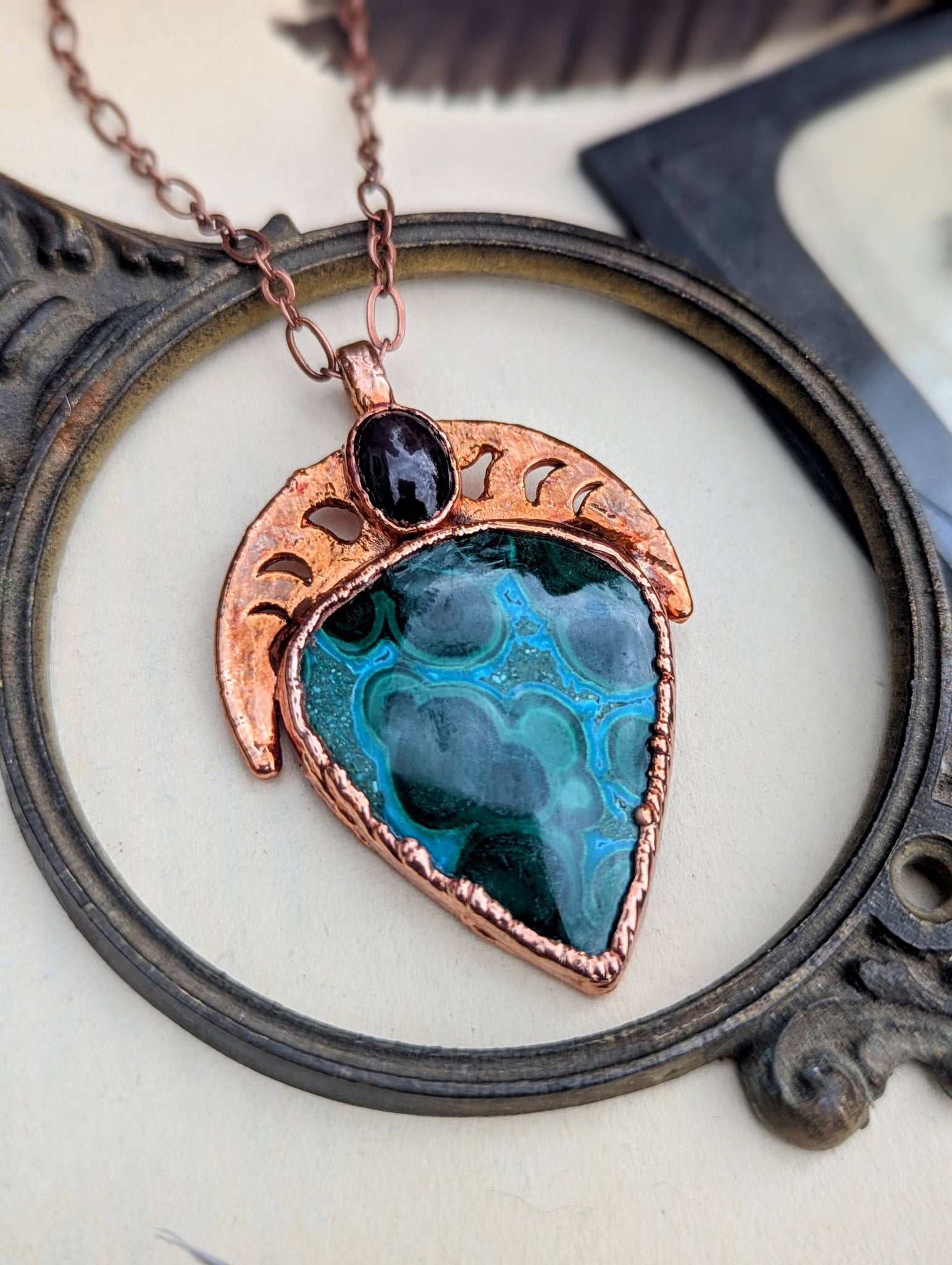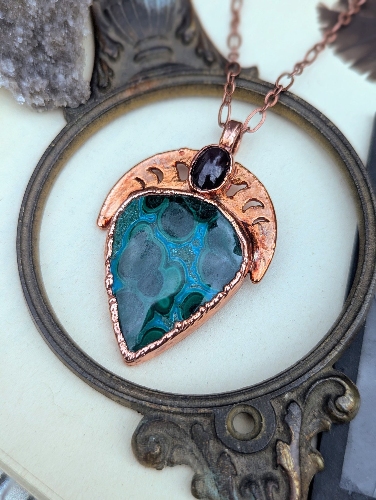 A hypnotic specimen of malachite, copper electroformed and accented with a moon phase moon, and star garnet.
