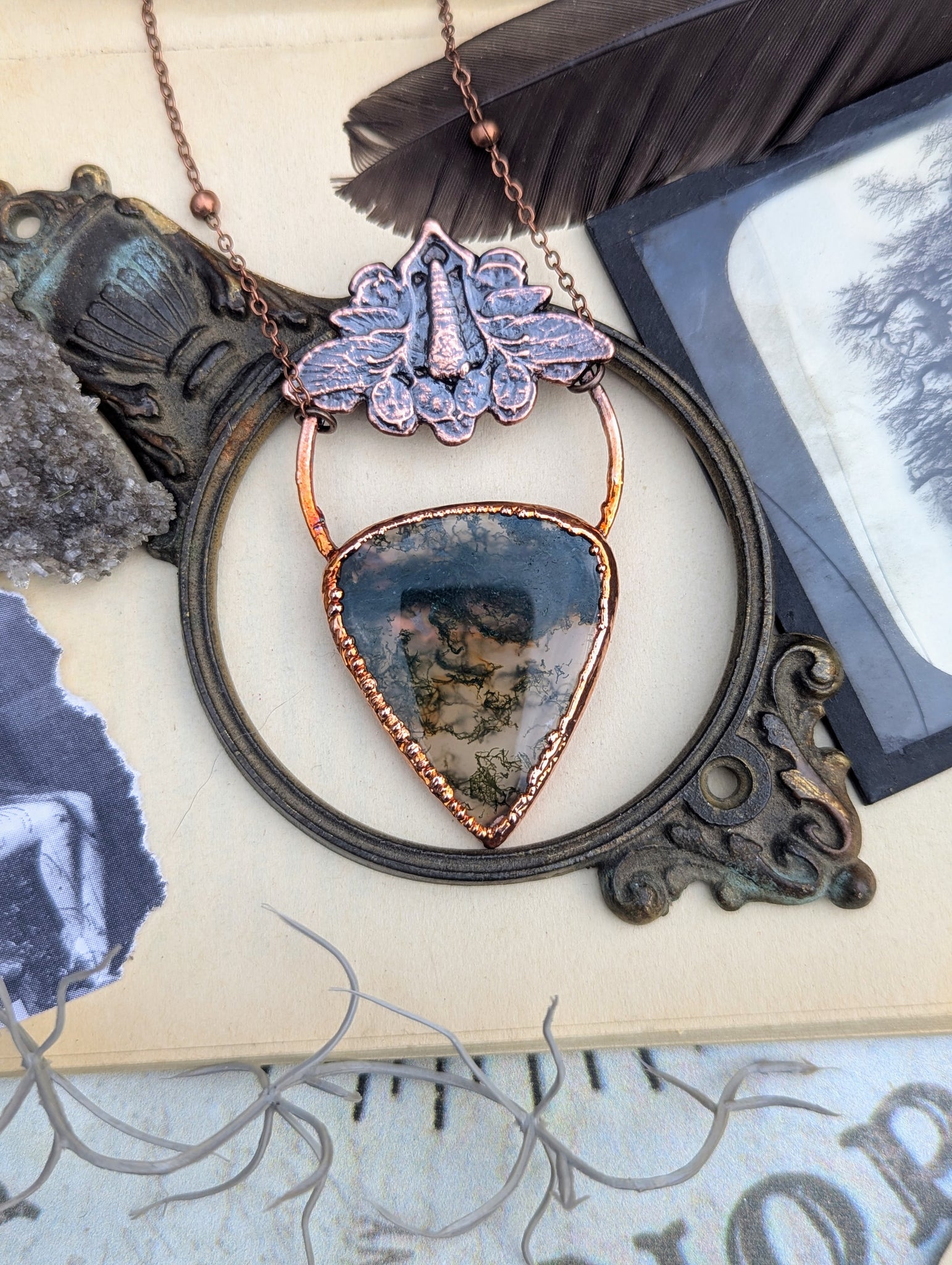 I've been enamored with moss agate since high school - the fact that it literally looks like moss growing in a stone blew my mind, and still does. Nature is amazing. This beautiful specimen of moss agate is copper electroformed with an art nouveau style moth charm.