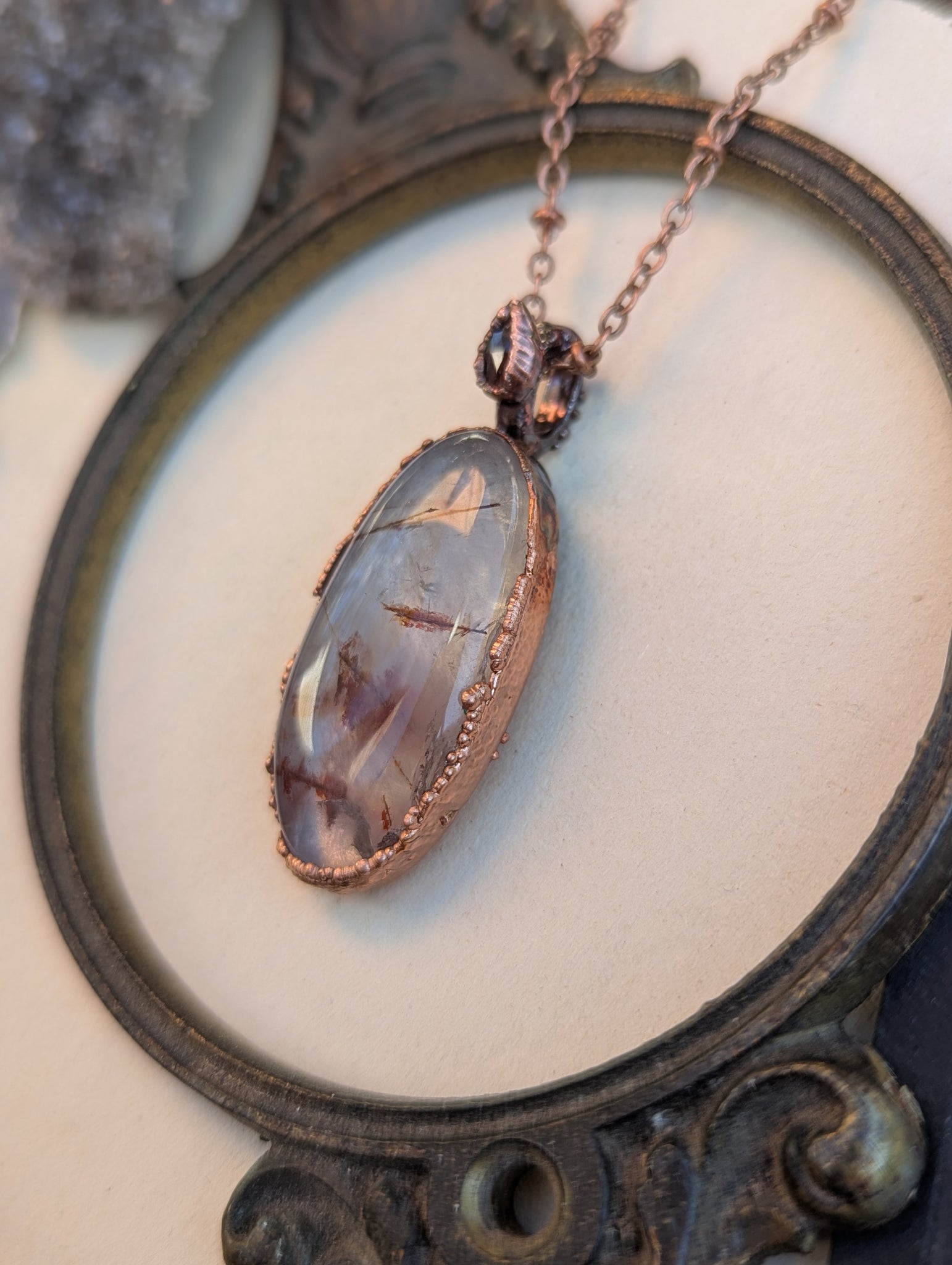 Are you a fan of slashers? Red rutile quartz immediately reminded me of slashes of blood. Beautiful and deliciously macabre. Copper electroformed with a tiny garnet.