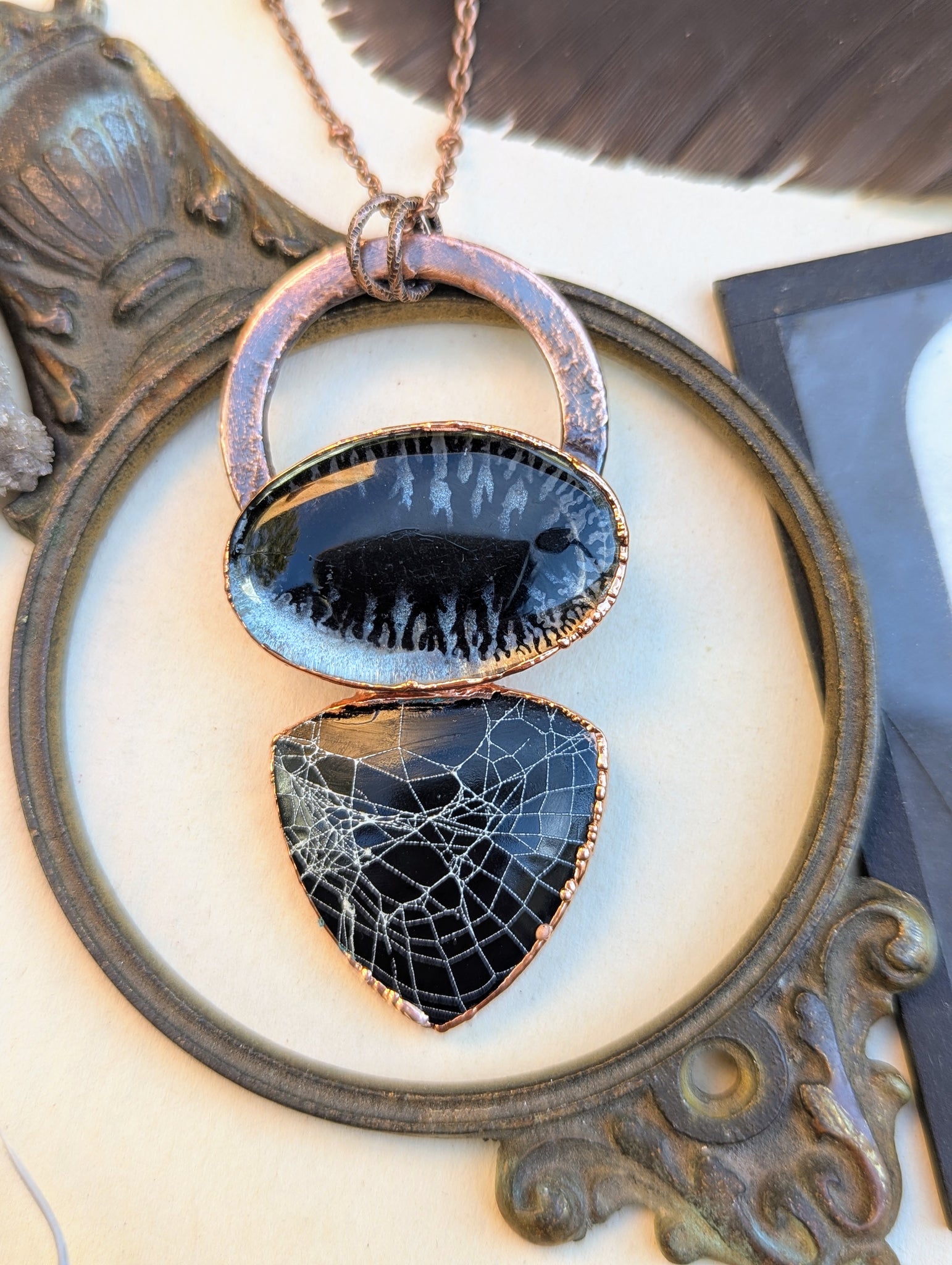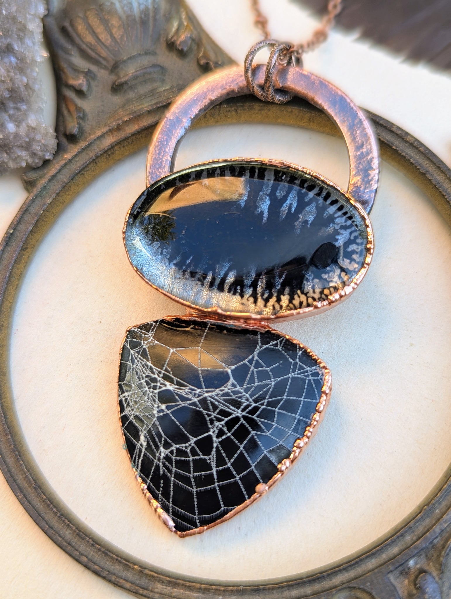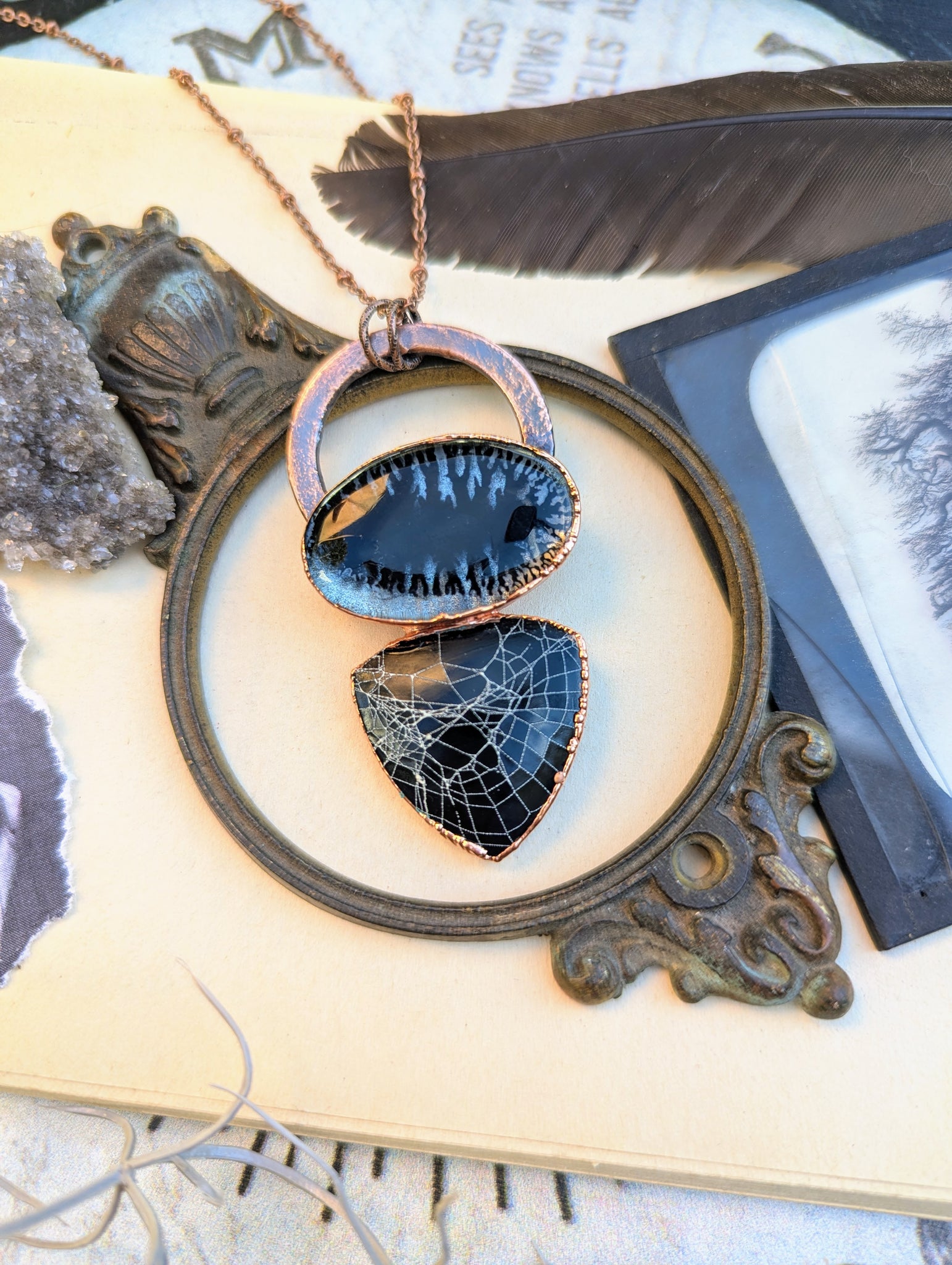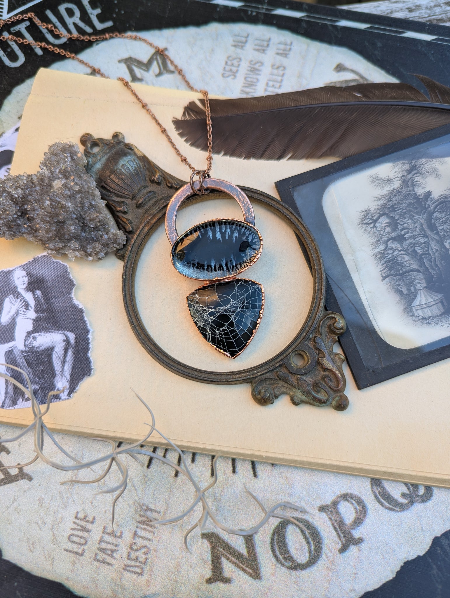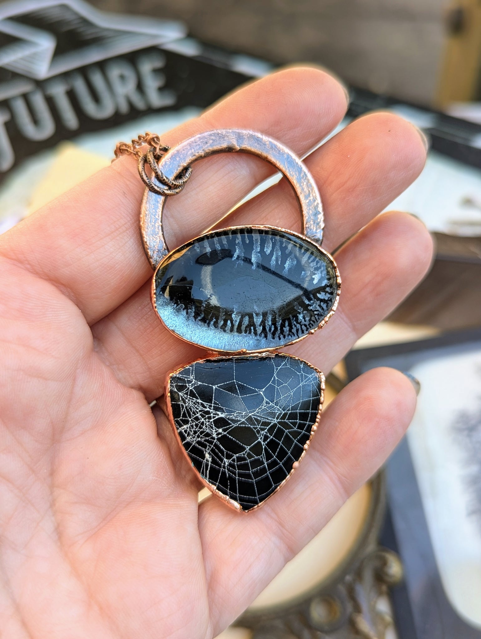 Real preserved spiderweb over a black billiard ball cabochon, complemented with an especially creepy dendritic doublet. I love how these patterns play together. The lapidary artist that created the incredibly unique spiderweb cabochon is no longer creating, so this is a very rare piece.