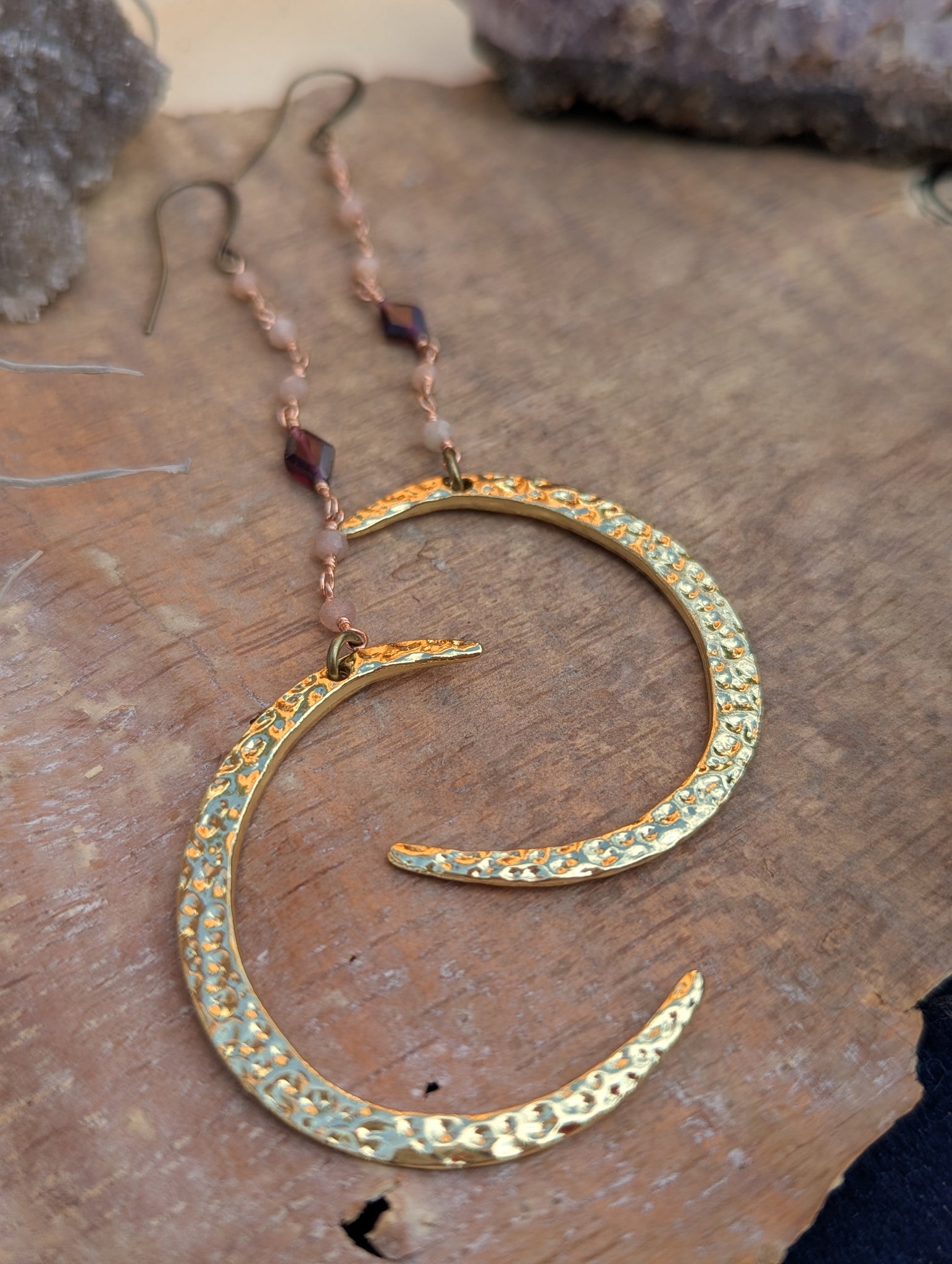 Goldtone moons hang from peach moonstone and garnet beaded chain.