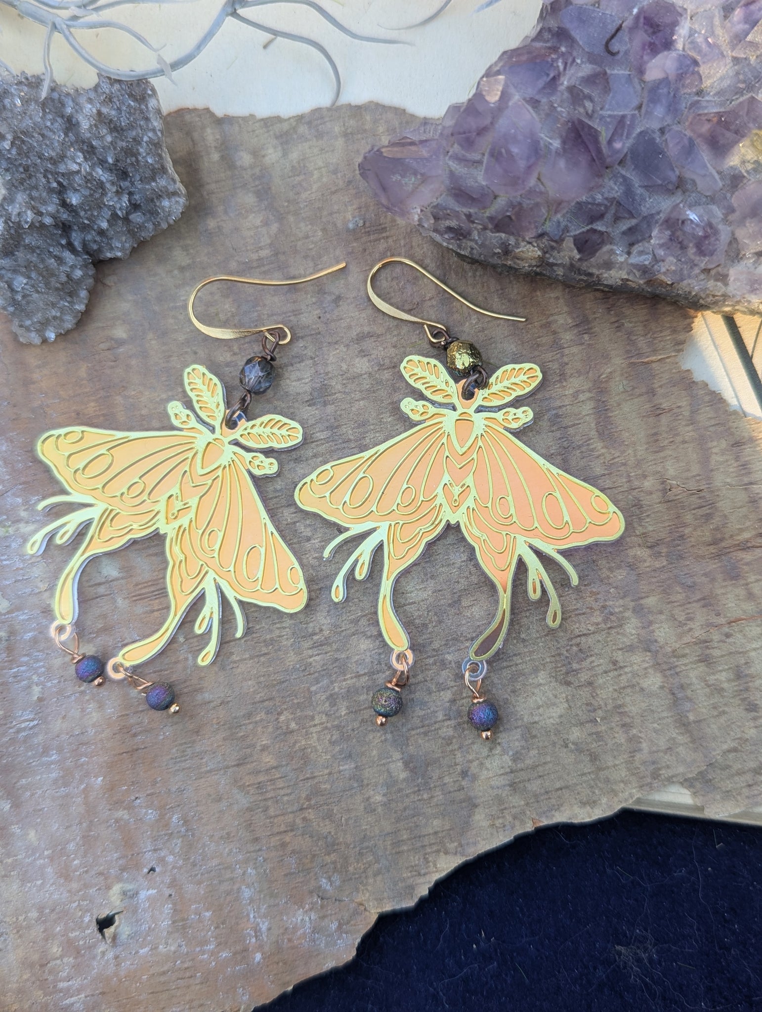 These iridescent acrylic and brass luna moths beautifully color shift in different lighting. Accented with Czech glass beads. These pretties are very light.